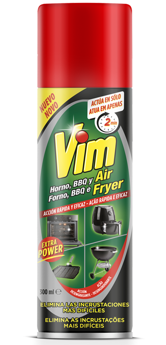 Vim Fornos, Grelhadores e Airfryer é adequado para a limpeza de fornos convencionais, fritadeiras de ar quente, tabuleiros, grelhas, churrasqueiras, grelhadores e frigideiras particularmente incrustadas. Atua sobre a sujidade persistente, os resíduos de gordura e as incrustações em apenas 2 minutos.